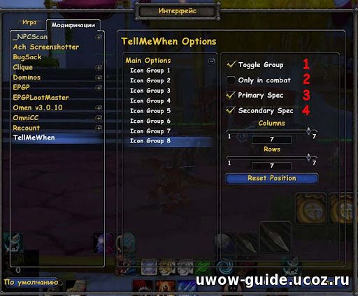 При включение аддона по умолчанию вы имеете 8 групп по 4 иконки в каждом.