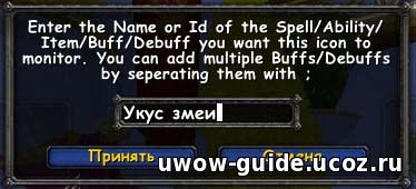 Нажав на первую строчку в меню, появляется окно в котором надо вписать без единой ошибки полное название дебафа и жмем приянть (тут по моему самый большой минус аддона - нельзя вписать название используя shift+клик, очень жаль)